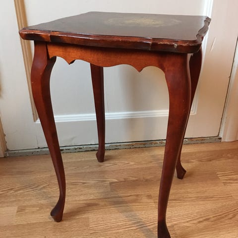 Stolen er laget i heltre, trolig bjørk eller mahogni, med varm, mørk patina. Forbenene er dreide, bakbenene svakt sabelformede, noe som gir både stabilitet og et elegant preg.