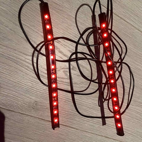 Et par LED-lykter med rødt og blått lys. Passer utmerket i en russebil, på discorommet hjemme eller som enerverende julebelysning rettet mot naboen.
