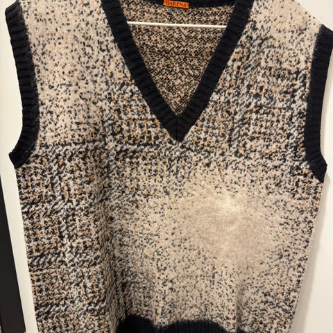 Hjemmestrikket vest som er strikket i garnet Karisma. Er beige/brun (lys). Selges for 800.