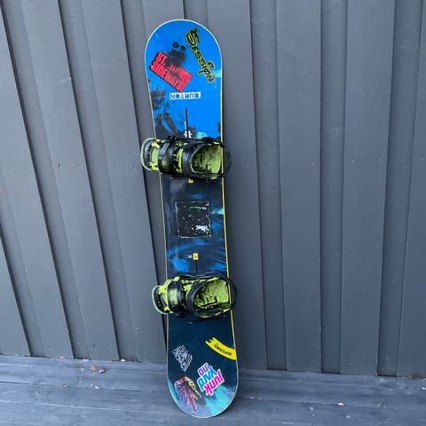 Leier ut fint lite nybegynnerbrett fra Burton. Lette Burton Grom sko str. 28 følger med. Det er også montert riglet (bånd til å dra snowboardet med).