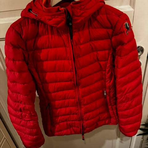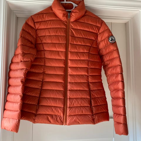Lett, tynn dunjakke fra Jott, laksefarget. Super vår-/høstjakke . Kan rulles sammen og legges i liten medfølgende pose. En liten flekk på innerside krage, se bilde. Jakka er ren (nyvasket) og ingen skader. Lite brukt. Str XL, men veldig liten i str. Mer en M /L vil jeg si.