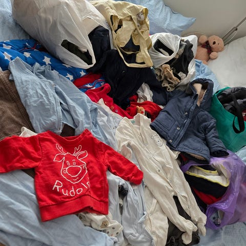 32 ulike plagg selges i pakke i størrelse 62 babyklær. Pent brukte barneklær. Bukser, gensere, bodyer, pysjer og ullklær.