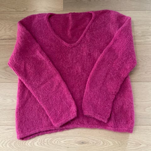 Pent og veldig lite brukt hjemmestrikket genser i rosaspettet garn, ullgarn. Str xs-s. Selges da den har blitt for liten.