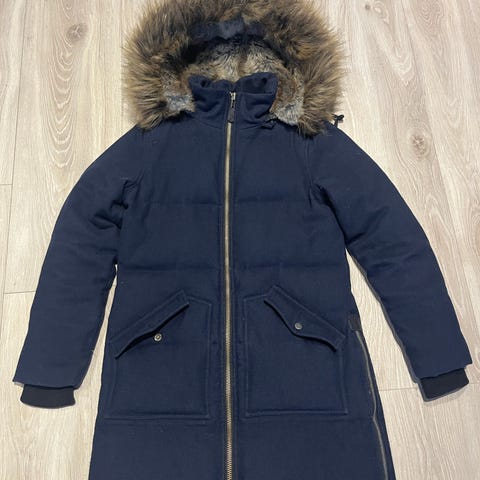 En klassisk og lite brukt dunparkas med avtagbar hette. Den er smal og pen i formen med glidelås og snøring i sidene. Fra danske merket ‘Minimum’.