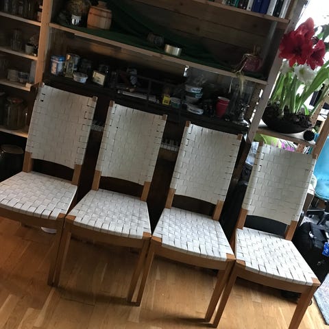 En liten spise gruppe på 4 stoler hvor den ene stole har en knent fot men det går ann å bruke den.