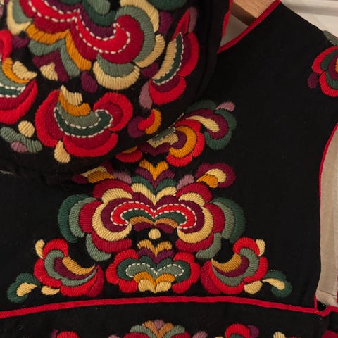 Hallingstakk, grønn ull, med småblomstret bunadskjorte i bomull, sydd på Ål. Meget pent brukt/uten synlig bruk.