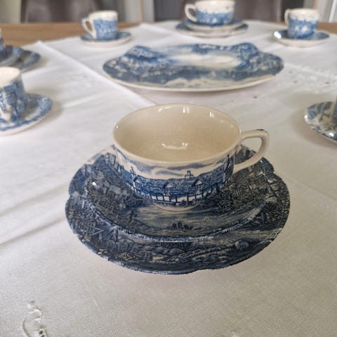 Nydelig samle service fra Wedgwood countryside. Hele og fine, nesten usynlige krakkelering på baksiden av noen asjetter . Jeg har 6 asjetter 17.5 cm. 6 tefat 11cm. Og 5 kopper 6 cm. Alle asjettene for 500 kr eller 100 kr pr stk. kopp og skål 150 pr stk eller alt for 800kr.