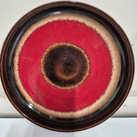Skikkelig stor retro keramikk skål/fat i brun-farge med rødt spettet med beige og brun inni skålen.