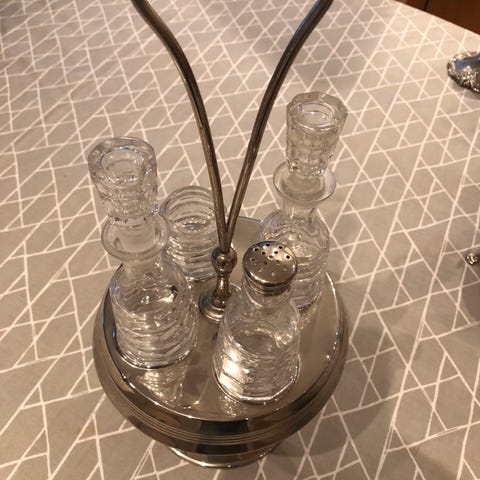 Retro salt, pepper sett, serverte holderen i keramikk