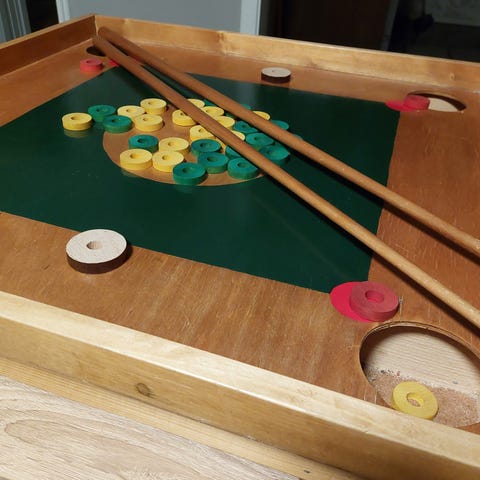 Stor boks med mye innhold. Yatzy, terninger, kortstokker, spillepenger, pokerterninger, hefte med spilleregler for 55 ulike spill.