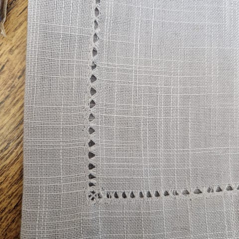 2 pene lunsjbrikker i okerfarge. Med fin hullkant rundt. Usikker på om det er lin, bomull eller blanding.