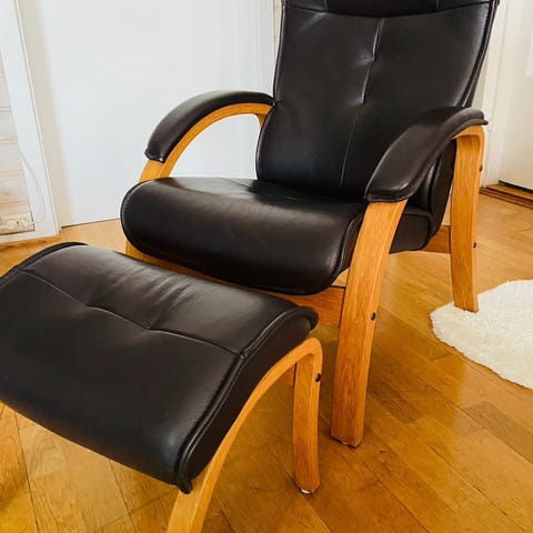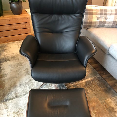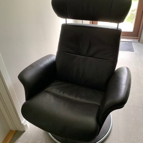 Nett og lekker sort Bravo lenestol fra Conform/ Bohus. Nesten ikke brukt, som ny uten merker. Skinn i Anilin kvalitet: dvs den beste kvaliteten, mykt naturlig og gjennomfarget. Blank fot med sving og retur til fast stilling.