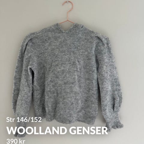Selger en Wolland merinoull genser med høy hals i str. 146/152, farge: rosa med sølv detaljer på armene. Genseren er kun brukt en gang, og fremstår som ny uten flekker, hull og nupper.