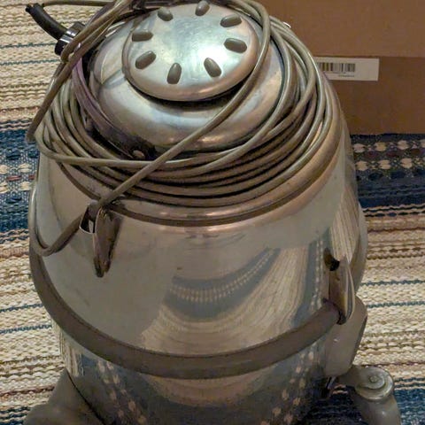 Jeg mener denne delen er til en gammel Hoover støvsuger. Den var på 70 tallet (sikkert eldre) på hytta til mine besteforeldre. Støvsuger var offwhite med en grønn stoff pose bak som blåste seg opp da strøm ble satt på. Vi tror denne delen hørte til støvsuger. Støvsuger er kastet