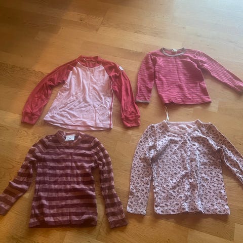 Pakken inneholder ulltrøyer og bomullstøyer. To skjørt og en shorts. Selges samlet. Kan hentes evt leveres etter avtale.