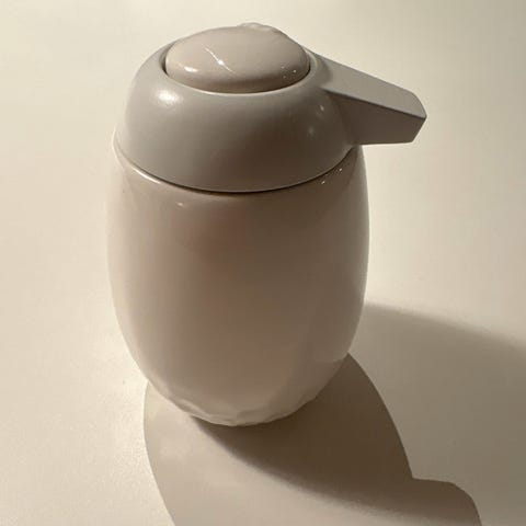 Såpedispenser i matt hvit keramikk selges billig.