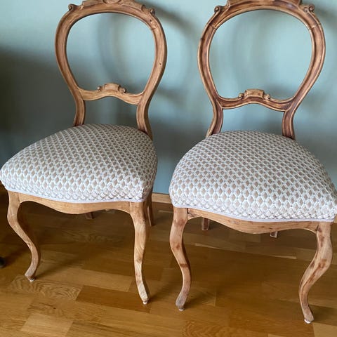 Nydelige rokokko stoler. Nesten nytt stoff. H: 92, Sittehøyde: 47, D:46, B:47. Selges 1500,- pr stk. 2500,- for to stk, 4500,- kr for alle fire.