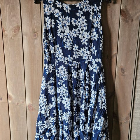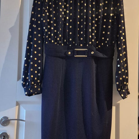 Polkadot mønstret kjole for dame i størrelse 42. Kjolen har mørk blå bakgrunn med hvite prikker og detaljer som gullfargede knapper. Den har et rødt fôr på innsiden.