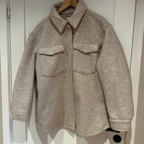 Selger en fargerik cardigan med nållukking foran. Akryl- og ullblanding.