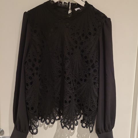 Nesten ny bluse i sort fra Cubus i størrelse 42 (L) med broderte armer. Selges kr 70