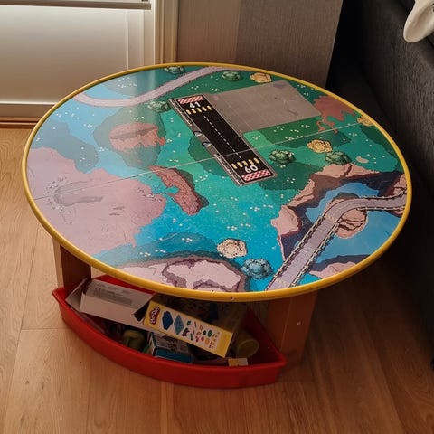 Bordplaten er vendbar, med byggeplate på ene siden og bordplate på andre siden.
