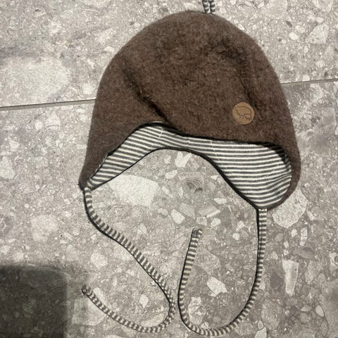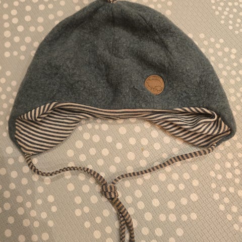 Ullue fra Nøstebarn med knyting under haka. Selve lua er i god stand, men båndene for knyting begynner å bli slitt.