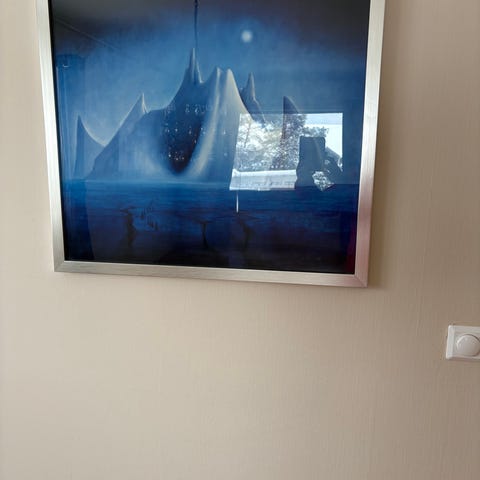 Selger dette imponerende bildet av et majestetisk isfjell med en liten fyrlykt i forgrunnen. Bildet har en dramatisk og stemningsfull komposisjon som virkelig fanger oppmerksomheten og skaper en unik atmosfære i rommet.