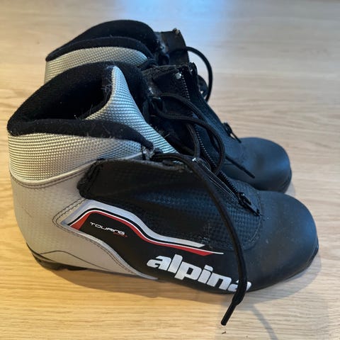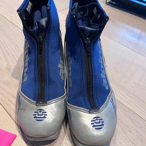 Blå og sølvfarget. Bilder av åpen og lukket sko.