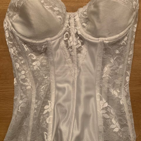 Blondekorsett kun brukt en gang under brudekjole. Str 65D. Avtakbare skulderstropper og strømpeholdere.