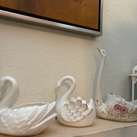 Flott vintage svane figur i porselen laget i Italia. Denne håndmalte svanen er både vakker og praktisk – den kan brukes som plantekrukke, lysestake eller smykkeskrin. Svanen har noen avskallinger og lett krakelering, men dette gir bare ekstra sjarm og en autentisk vintagefølelse. Antagelig fra 70-tallet. Perfekt for å vise frem små planter, sette et telys i, eller oppbevare smykker og småting. Den passer godt i stue, soverom eller bad. En ideell gjenstand for de som setter pris på vintage dekorelementer, fuglefigurer, eller er ute etter noe både vakkert og funksjonelt. Se bilder for mål. Andre bilde er lånt fra etsy. 🕊