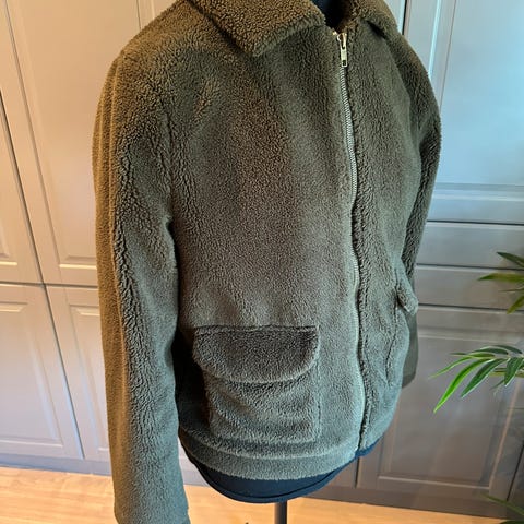 Stilig jakke i teddystoff med ståkrage. Kjøpt på bruktbutikk i New Zealand. Ingen lapper, men passer fint for M/L dame eller S/M herre. Deilig og varm.