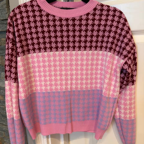 Fresh og søt strikket genser i rosa og grønn/grå.