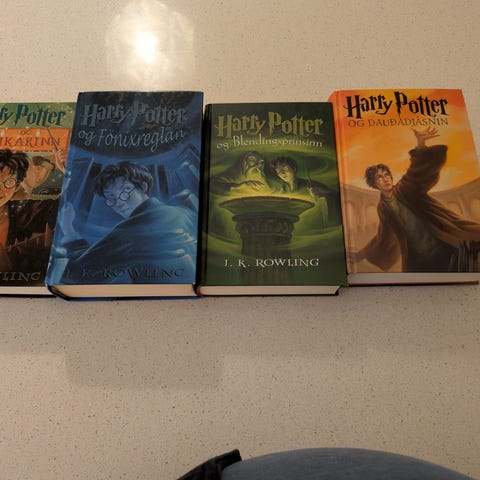 Harry Potter Bøker selges. Lest en gang bare, og er pent behandlet, men en liten skade i Føniksorderen. Bøkene er på norsk.