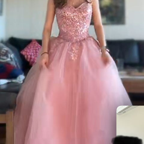 Nydelig ballkjole i dus rosa farve meg gull detaljer selges. Ho som har brukt kjolen e 166 og hadde 4cm hæl.