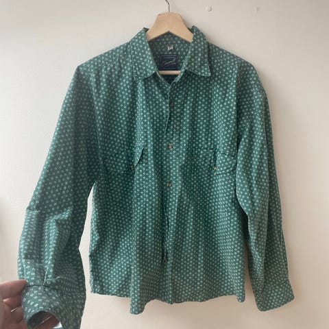 Behagelig vintage skjorte, i spennende mønster. Vært med meg gjennom mange eventyr, merkes kun på viben, ikke slitasjen