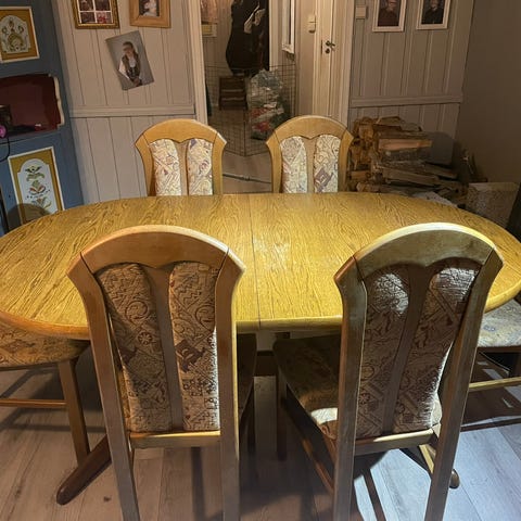 En sjelden mulighet. Komplett spisestue med seks stoler med tilhørende skjenk og skap i vakker mørk flammebjørk. Noen bruksmerker.