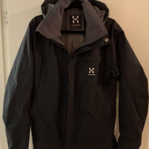 2,5 lags skalljakke fra Haglöfs, dame, sort, str. S, litt lang modell. Gore-tex. Mangler en liten «stropp» på den ene glidelåsen (venstre lomme, se bilde).