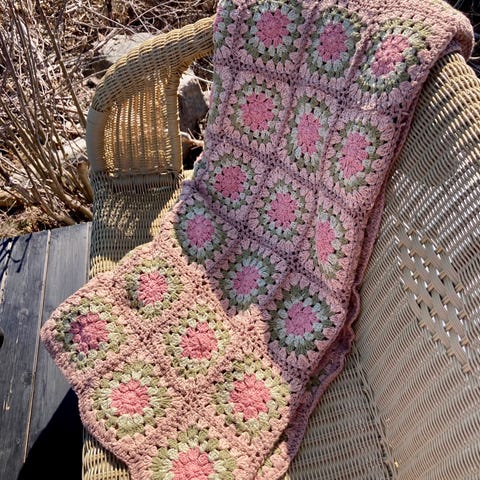 Teppet er satt sammen av heklede bestemorruter av Merino babyull 100% superwash merinoull