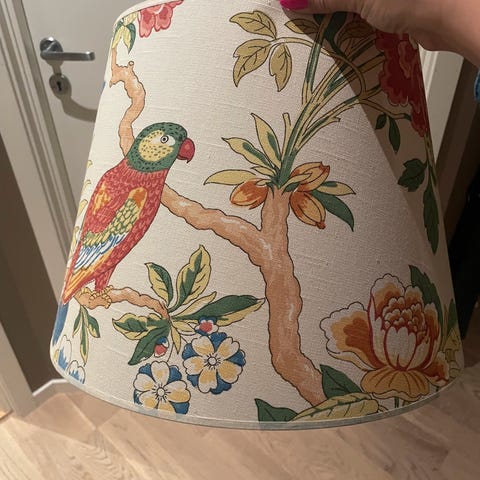 Nydelig stor sylinderformet lampeskjerm i fløyel stoff, farge taupe ( varm grå/ beige farge)