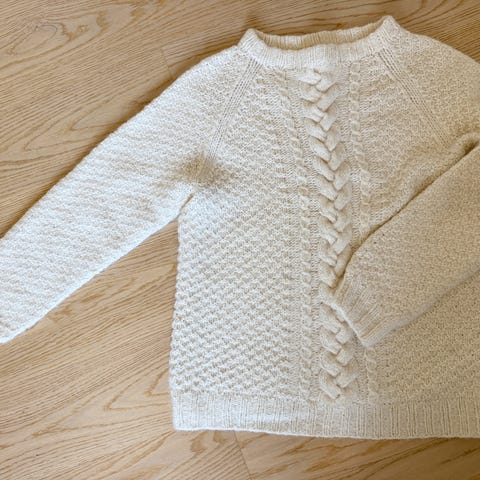 Genseren er beige, strikket i to ulike garn typer , alpakka ull og alpakka silke. Dette gir et svakt melert fargeinntrykk . God passform.