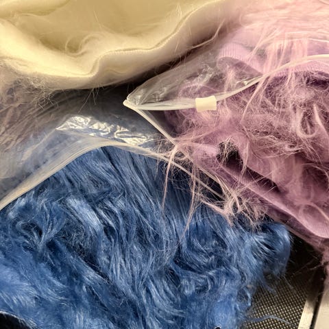 Har to ruller med det jeg kaller fuskepels i fargene mørk lilla og rosa. Kjøpt på rainbow tekstil til et prosjekt som ble skrinlagt. Bilder er lånt fra skapemer.