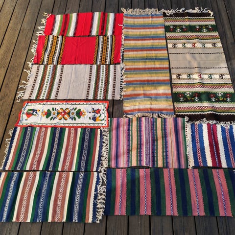 Til høyre. Liten håndvevd duk. Mål: 41 x 21 cm + tafs. Selges kr. 75.