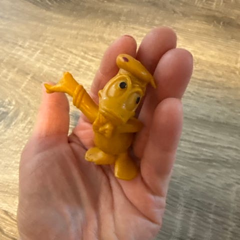 Veldig gammel Donald duck leke som plystrer når den trykkes på. Fant ett sett med 4 leker som var oppført at de stammet fra 50 tallet. Tror ikke det er så gammelt, en åpenbart gammelt