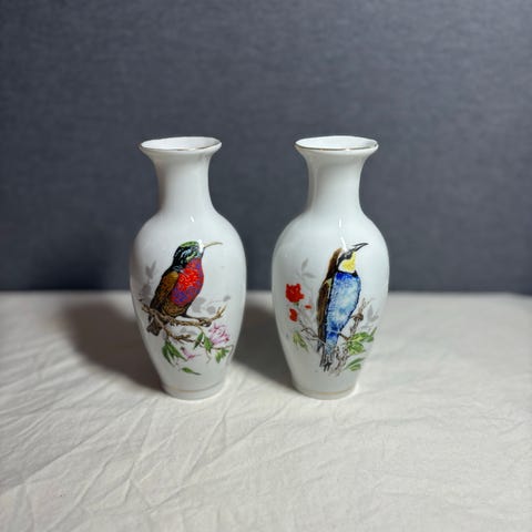 Selger to dekorative fuglevaser med 2 fugler på begge sider. Vasene er 11,5 cm høye og har vært godt brukt, men er fortsatt i god stand. Perfekte som pynt i hjemmet eller som en gave til en fugleentusiast. Ta kontakt ved interesse!