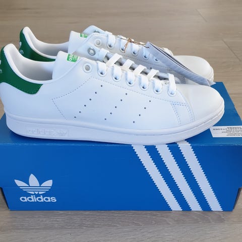 Stan Smith grønne sneakers er ikke lette å få tak i! Det er kun litt synlig på sålene at de er brukt fra før. (Nypris minst 1200,-)