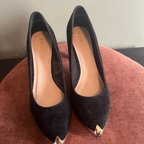 Ekstra høye pumps i semsket look med strass på helkappen. Kule sko som er noe oppbygget / platå.