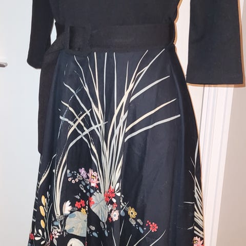 Nydelig kjole som har hengt i skapet i noen år aldri brukt det er mørke blå og hvit farge 88 cm lengde kan sendes PostNord frakt 69