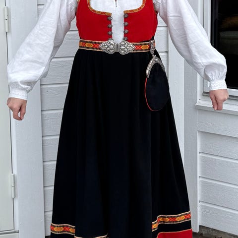 Alt på bildet følger med: begge forkler, sølvbelte, sølv veske, cape, sko str 41.