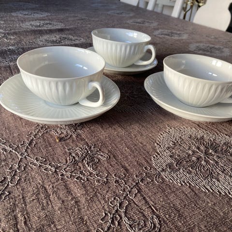 Hvite med dekor i gull langs kanter og på hank. Bølgete formasjoner.