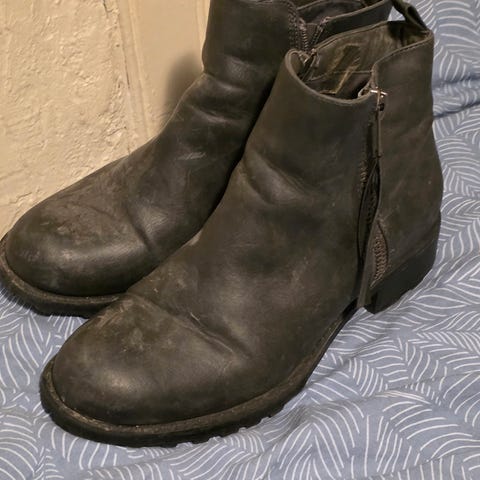 Svarte boots med glidelås i siden selges. De er lite brukt, men har fått noen skrape merker på venstre sko (se bilde). Selges derfor rimelig. Perfekt til kjole og bukse, både på jobb og en tur ut på kvelden. Størrelse 40. Nypris 899,-
